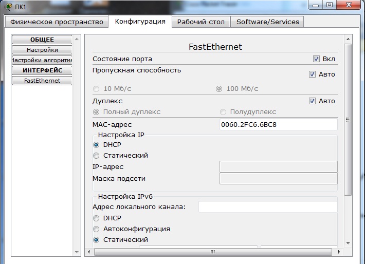 Войдите в конфигурацию ПК1 и установите настройку IP через DHCP сервер рис.3.2.