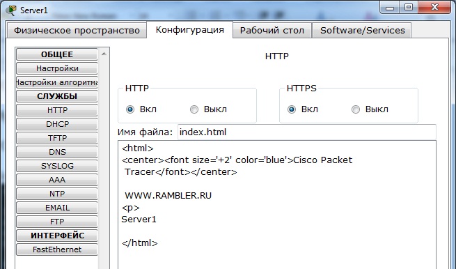 В конфигурации Server1 водите на вкладку HTTP и задайте стартовую страницу сайта WWW.RAMBLER.RU (рис.3.5):