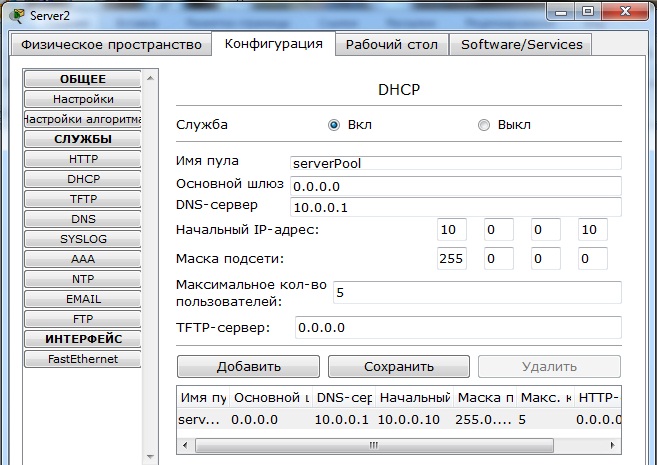 Для этого войдите в конфигурацию Server2 и на вкладке DHCP настройте службу (рис.3.7):