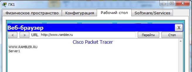 3 - Компьютер ПК1 получает параметры протокола TCP/IP c DHCP сервера и открывает сайт www.rambler.ru на Server1.