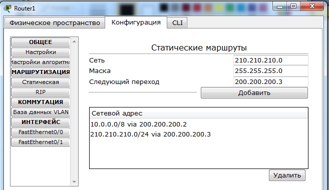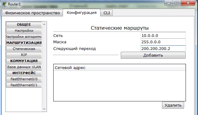 Проведем настройку статической маршрутизации с помощью графических мастеров интерфейса Cisco Packet Tracer.