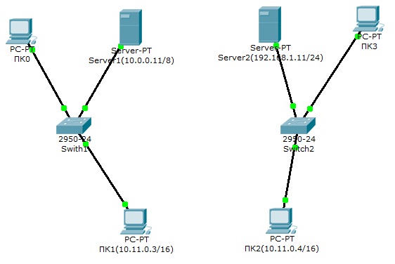 Компьютеры ПК1 и ПК2 находятся в отдельной сети в одном VLAN.
