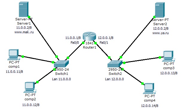 1 - компьютеры comp3 и comp4 доступны друг для друга и должны открывать только сайт своей сети, вход в сеть 11.0.0.0 им заблокирован;