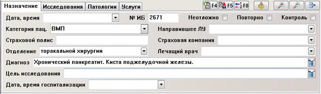 Страница «Назначение» предназначена для ввода и отображения данных назначения на исследование: даты и времени назначения, номера истории болезни, категории пациента, направившего лечебного учреждения, лечебного отделения и др. Внешний вид страницы представлен на рис. 4.5.2.