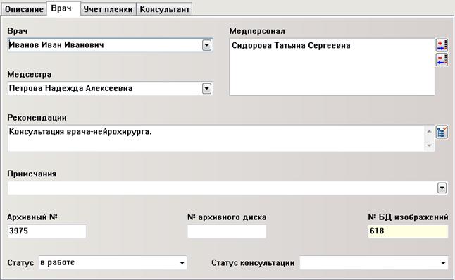 Поля «Медперсонал», «Статус» и «Статус консультации» могут заполняться только из справочников. Все остальные поля позволяют вносить данные вручную с клавиатуры.