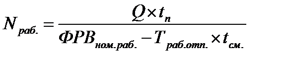 Потребная численность рабочих на выполнение данной производственной программы определяется исходя из времени, необходимого на изготовление этого количества деталей и эффективного фонда времени рабочего (фонда времени с учётом отпуска). Получим следующую формулу:
