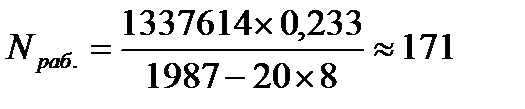 Отметим, что по формуле (5.1) мы определим только численность рабочих, так как только они непосредственно заняты в реализации производственной программы. Отпуск дан в календарных днях для всех категорий рабочих – 28 оплачиваемых дней. В рабочих днях он равен 20 дням. В этом случае берём то же количество рабочих дней в неделю, что и при расчёте номинального фонда рабочего времени (5 дней). При этих условиях численность рабочих равна: