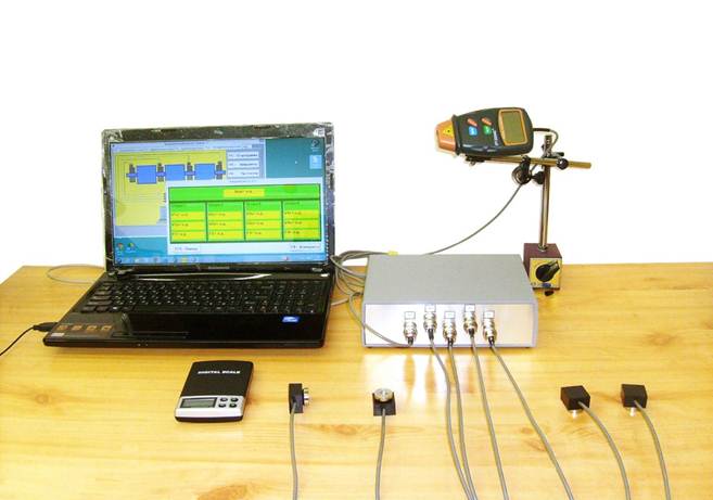 Для преобразования механических колебаний в электрический сигнал используются датчики вибрации – емкостные интегральные акселерометры 2-5. Для определения фазовых характеристик сигнала используется оптический лазерный тахометр 6, работающий на отражение.