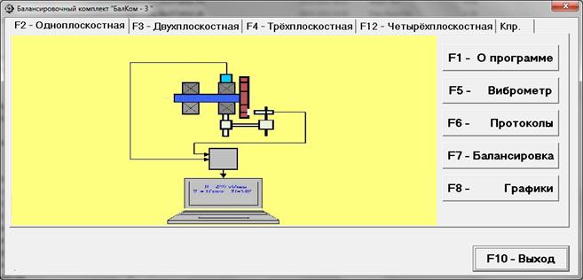 При нажатии кнопки «F2-одноплоскостная» (или функциональной клавиши F2 на клавиатуре компьютера) производится выбор режима измерения вибрации в одной плоскости с использованием датчика вибрации 1, подключённого к входу Х1 измерительного блока.