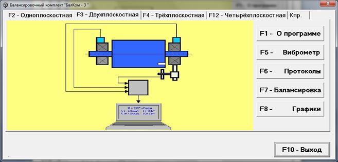 При нажатии кнопки «F3-двухплоскостная» (или функциональной клавиши F3 на клавиатуре компьютера) производится выбор режима измерения вибрации одновременно в двух плоскостях с использованием датчиков вибрации 1 и 4, подключённых соответственно к входам Х1 и Х4 измерительного блока.