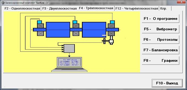 При нажатии кнопки «F4-трёхплоскостная» (или функциональной клавиши F4 на клавиатуре компьютера) производится выбор режима измерения вибрации одновременно в трёх плоскостях с использованием датчиков вибрации 1, 2 и 4, подключённых соответственно к входам Х1, Х2 и Х4 измерительного блока.