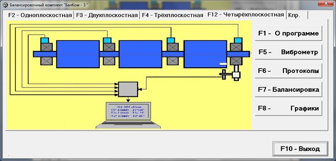 При нажатии кнопки «F12-четырёхплоскостная» (или функциональной клавиши F12 на клавиатуре компьютера) производится выбор режима измерения вибрации одновременно в четырёх плоскостях с использованием датчиков вибрации 1, 2, 3, 4, подключённых соответственно к входам Х1, Х2, Х3 и Х4 измерительного блока.
