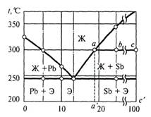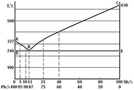 В точке В при массовом содержании 13 % Sb, 87 % Pb и при температуре 246 °С кристаллизация свинца и сурьмы происходит одновременно; образуется тонкая механическая смесь кристаллов свинца и сурьмы (двух фаз). Эта смесь называется эвтектикой.