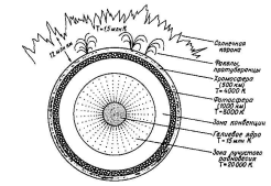 В структуре Солнца различают внутреннюю часть или гелиевое ядро с Т~15 млн. К и давлением 300 млрд земных атмосфер, далее располагается зона радиации (10 млн К) и конвекции (2 млн К). Видимая поверхность Солнца - фотосфера, мощностью до 1 тыс. км и с Т = 6000 К, а самую внешнюю часть Солнечного диска составляет хромосфера, мощностью 10-15 тыс.км с Т~20000 К.
