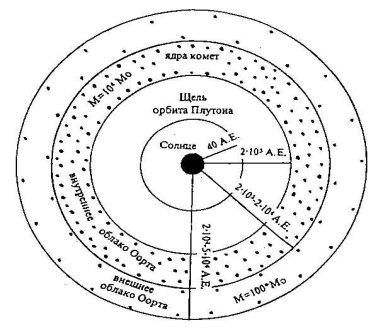 Вокруг Солнца вращаются девять планет. Меркурий, Венера, Земля и Марс, ближайшие к Солнцу планеты относятся к внутренним или планетам земной группы. Далее, за поясом астероидов, располагаются планеты внешней группы - гиганты Юпитер, Сатурн, Уран, Нептун и маленький Плутон. Расстояние от Солнца до Плутона равняется 40 астрономическим единицам. За Плутоном находится “щель” - кольцо с радиусом 2*103АЕ., где практически нет вещества. Далее, в интервале 2*103 – 2*104 А.Е. располагается кольцо с огромным количеством материи в виде ядер комет и угловым моментом в 100 раз превышающим современный угловой момент всей Солнечной системы. Это, так называемое, внутреннее облако Орта. Еще дальше, в интервале 2*104 – 5*104 А.Е. располагается собственно облако Оорта, состоящее также из ядер комет с общей массой ~100 масс Солнца и угловым моментом в 10 раз выше, чем у планетной системы. По существу, радиус в 5*104 А.Е. и определяет современную границу Солнечной системы в широком смысле этого понятия.