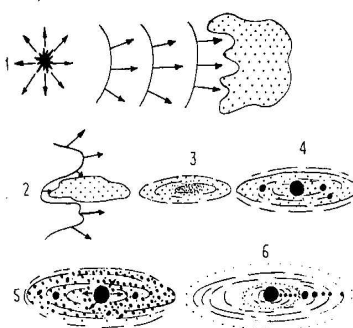 Звезды типа Солнца - желтые карлики, формируются при сжатии газопылевых облаков, масса которых должна быть не меньше 105 массы Солнца. По одной из гипотез на него мог повлиять взрыв близкой сверхновой звезды, ударные волны от которого и заставили облако сжиматься и вращаться. По другой- газопылевое облако в силу своего участия в общем вращении ГМП начало сжиматься, однако большой момент вращения не допускает дальнейшего сжатия, и облако распадается на отдельные сгустки- будущие планеты. Надо отметить, что начальный момент превращения газопылевого облака в протопланетный диск, наименее ясный момент в процессе формирования Солнечной системы.