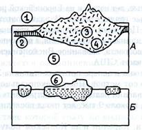 Рис. А — «корень» гор. Чем выше горы, тем «корень» гор глубже проникает в верхнюю мантию: 1 — океан, 2 — океаническая кора, 3 — континентальная кора, 4 — «корень» гор, 5 — верхняя мантия. Б — айсберги (6), плавающие в морской воде. Над поверхностью воды возвышается 1/3 ледяной глыбы