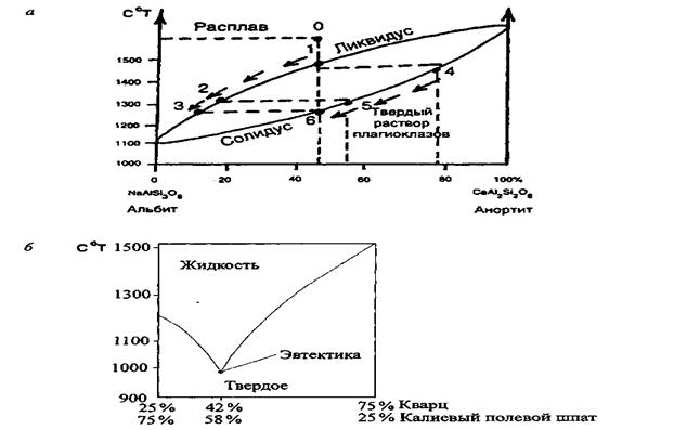 Рис. а — диаграмма плавкости для твердых растворов плагиоклазового ряда (по Н. Боуэну). Давление Р - 1 атм. Состав выделившихся из расплава кристаллов определяется на оси. Точки 1, 2, 3, 4, 5 и 6 обозначают разные стадии кристаллизации расплава; б — эвтектика — плавление двух минералов при минимальной температуре