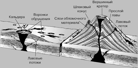 Сложные полигенные вулканические постройки состоят из конусов, образованных потоками лавы и толщами тефры и называются стратовулканами (стратум – слой, лат.). Образуются они при чередовании эффузивных и эксплозивных извержений,