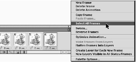 В меню палитры анимации выберите Select all frames (выбрать все фреймы).