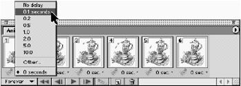 чтобы открыть всплывающее меню Frame Delay (задержка фрейма) и установите время 0,1 сек. Новое значение появляется под миниатюрой каждого фрейма, показывая, что изменение применено ко всем фреймам в палитре. Естественно, можно менять это время для каждого фрейма в отдельности. Кликнем кнопку Play