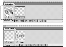 В палитре анимации перетащим фрейм 2 налево, отпустив кнопку мыши, когда черный прямоугольник появится левее фрейма 1.