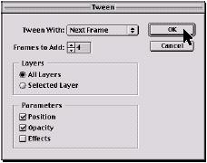 меню палитры. В диалоговом окне Tween установим следующие опции. В раскрывающемся меню Tween With (между какими фреймами вставить), выберем Next Frame (следующий фрейм). Для Frames to add (количество добавляемых фреймов) выберем 4. В пункте Layers выберем All layers (все слои). В разделе Parameters поставим галочки в окошках Position (положение) и Opacity (непрозрачность). Вообще-то можно также выбрать и Effects для изменения установок эффектов слоев между начальным и конечным фреймом. Но сейчас это не нужно, так как мы не применяли к слоям никаких эффектов. Наконец, закроем диалоговое окно, кликнув OK.
