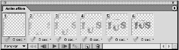 Видим, что ImageReady создала четыре новых промежуточных фрейма, основанных на установках прозрачности и расположения первого и последнего фрейма. В раскрывающемся меню Looping (зацикливание)в нижнем левом углу палитры анимации выберем Once (один раз). В палитре анимации нажмите кнопку Play