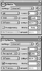 Щелкнем кнопку с двойной стрелкой в палитре оптимизации, чтобы развернуть палитру или выберите Show Options в меню палитры оптимизации. Установите следующие опции. File format – GIF. Color reduction algorithm – Perceptual. Colors number – 256. Поставьте галочку в окошке Transparency, чтобы сохранить прозрачность. Для опции Matte (подложка) в раскрывающемся меню выберите белый цвет (white).