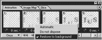 В меню палитры анимации выберите Select all frames (выбрать все фреймы). Кликните правой кнопкой мыши по одному из фреймов в палитре анимации, чтобы открыть контекстное меню Disposal method (метод исчезновения) и выберите Restore to background
