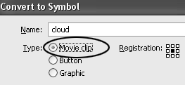 После этого, пока ваше облако еще выделено, нажимаем F8 (Convert to Symbol (Конвертирование в Символ)) на клавиатуре, чтобы конвертнуть нашу графику в Movie clip. Также, это действие можно выполнить если пойдем в Modify>Convert to Symbol. В открывшемся диалоговом окне выбираем Movie clip. Нажимаем ОК.