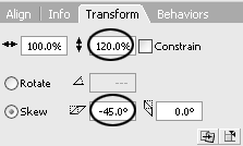 Выбираем продублированный прямоугольник на нижнем слое и используем Панель Трансформация (Transform) для Горизонтального вытягивания исдвига (Horizontal stretch и skew). Задаем следующие параметры: