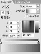 Теперь, залейте овал градиентом. Убедитесь, что Панель Color Mixer (Смешение цветов) открыта, если нет, выберите в верхнем меню Window > Color Mixer и введите в раскрывшемся окне панели следующие параметры: Type—Linear; R—81; G—81; B—81; Alpha—100% (овал должен быть при этом выделен, естественно).