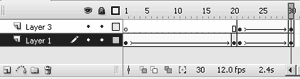 Выделим 21 кадр в обоих слоях и сделаем его ключевым, выбрав в контекстном меню команду Insert Keyframe. Затем выделим любую из двух частей нашей формы и в контекстном меню выберем команду Вырезать (Cut). Выделим 21 кадр второго слоя и в меню Edit выберем команду Paste in Place.