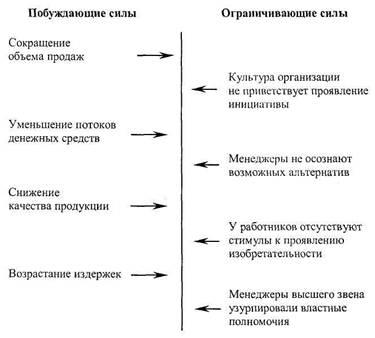 Осуществление изменения предполагает либо возрастание значения побуждающих факторов, либо уменьшение ограничивающих, либо некую комбинацию взаимодействий, приводящих к нарушению их баланса. На рис. 3.1 представлены силы, поддерживающие равновесие в организации, которая недавно претерпела серьезные изменения.