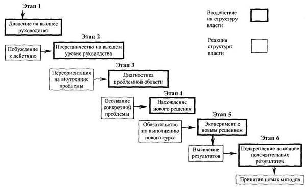 Этап 4. Нахождение нового решения и обязательства по его выполнению. После того как признано существование проблемы, руководство ищет способ исправления ситуации. В большинстве случаев руководство также должно заручиться согласием на проведение нового курса тех, кто отвечает за его выполнение. Комментируя этот этап, Грейнер говорит: «Всегда имеется искушение, особенно для структур власти, применить старые решения к новым проблемам. Таким образом, возникает необходимость четвертого этапа — отыскания новых и уникальных решений, которые были бы поддержаны всей структурой власти».