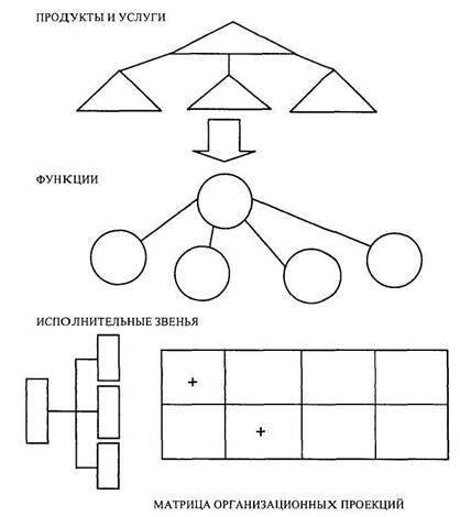 Модель организационной структуры (рис. 4.1) включает иерархический перечень продуктов и услуг, предоставляемых компанией; иерархический перечень функций, поддерживающих производство и предоставление продуктов и услуг; иерархический перечень исполнительных звеньев, обеспечивающих реализацию функций; матрицу организационных проекций, описывающую закрепление функций за исполнительными звеньями.