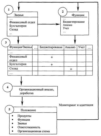Прежде всего, нужно понять, кто и что делает в компании. Выражаясь бухгалтерским языком, провести тотальную «инвентаризацию» подразделений, персонала и функций. Директору надо выяснить, сколько функций связано с деятельностью его компании и какие звенья отвечают за их выполнение (рис. 4.2, блоки 1, 2).