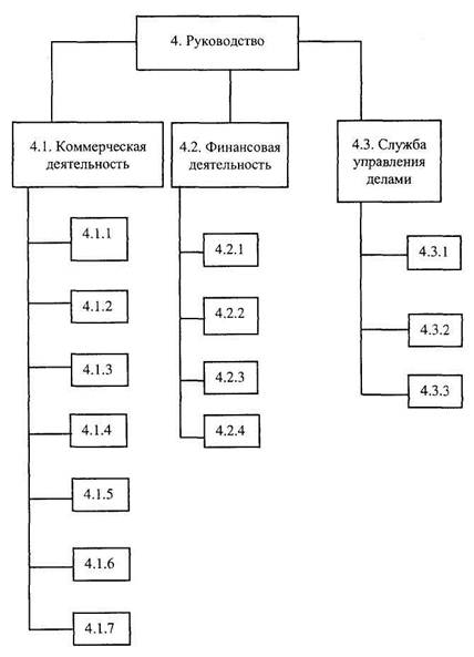 | 4.1 | Коммерческая деятельность | 4.1.1 4.1.2 4.1.3 4.1.4 4.1.5 4.1.6 | Отдел закупок Транспортный отдел Отдел маркетинга Отдел сбыта (региональные и городские продажи) Склад Отдел статистики |