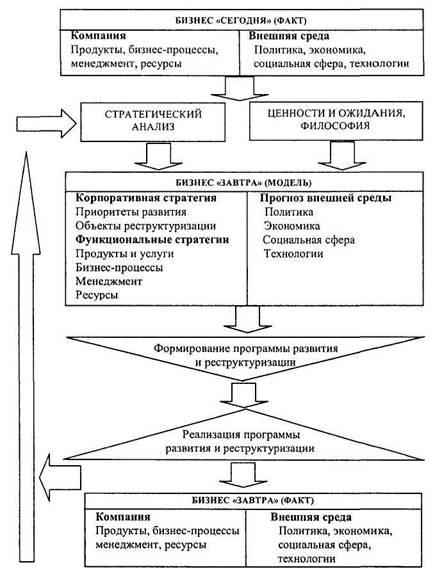 В более широком аспекте разработка стратегии предопределяет разработку не только проекта организационной структуры, но и построение программы изменений и реструктуризацию бизнес-процессов.