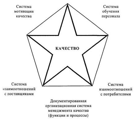 В основание «звезды качества» положена система управления качеством, соответствующая определенной концепции. Предположим, что система документирована и охватывает организационную структуру управления предприятием, а также систему управления процессами создания продукции. Последнее очень важно: мы рассматриваем организацию и как функциональную структуру, и как совокупность процессов.