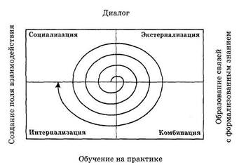 Содержание знания и спираль создания знания. Как мы уже говорили, цель социализации — распространение неформализованного знания. Социализация же сама по себе — один из способов создания знания. Пока неформализованное знание не превратилось в формализованное, оно не может быть легко распространено в пределах организации. Точно так же, ограничившись всего лишь сложением разрозненных фрагментов формализованной информации (например, бухгалтер, собирающий информацию для финансового отчета со всей компании), нельзя расширить существующую базу знания. Но в случае взаимодействия неформализованного и формализованного знаний имеет место инновация.