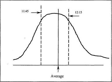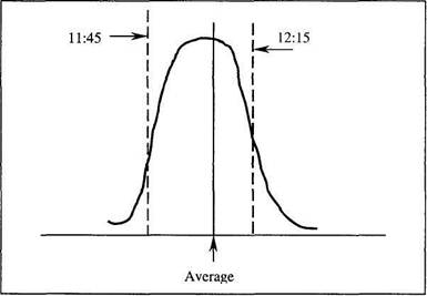 На рис. 8.4 вариабельность доставки пиццы велика. Большое количество пиццы доставляется раньше срока и большое количество — позже. Среднее время доставки — все еще в пределах требований потребителей (доставка между 11.45-12.15). Этот рисунок демонстрирует низкий уровень сигм.