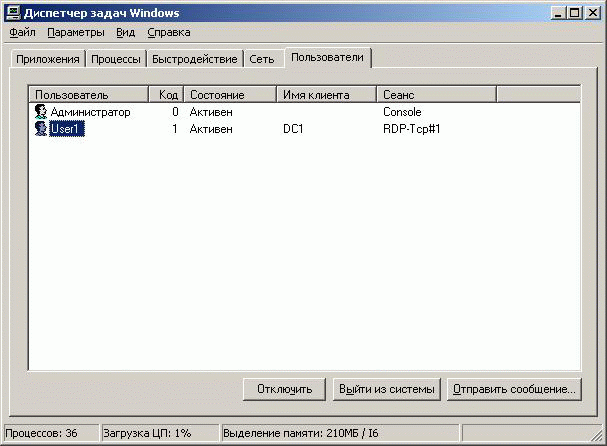 Удаленные пользователи подключаются к системе через службы терминалов, или удаленные рабочие столы. Подключения с помощью удаленного рабочего стола активизируются автоматически при установке Windows Server 2003. " Диспетчер задач " предоставляет один из способов управления такими подключениями. Перейдите на закладку " Пользователи ", где перечислены пользовательские сеансы как для локальных, так и для удаленных пользователей (рис. 16.18):