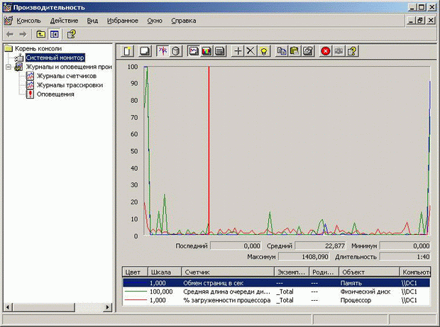 Работа консоли " Производительность " основана на понятиях " Объект " и " Счетчик ". Понятие " Объект " относится к той или иной компоненте системы или к определенному приложению и состоит из набора " Счетчиков ", числовых показателей, измеряющих степень загруженности данной компоненты. Набор доступных объектов и счетчиков обновляется при установке служб и дополнительных компонент. Например, после установки на сервере службы DNS консоль " Производительность " пополняется рядом объектов и счетчиков для отслеживания работы этой службы.