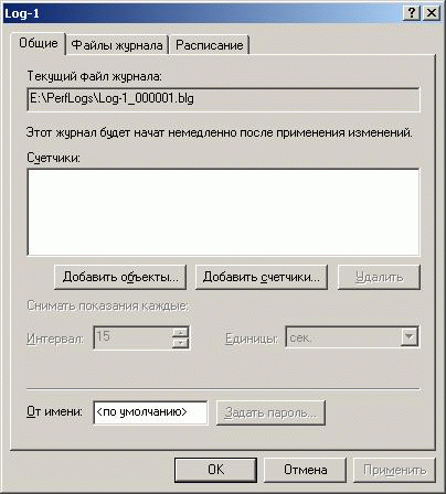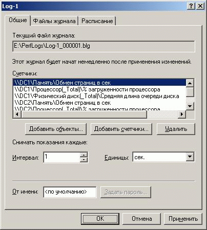 При создании самого первого журнала на томе с системой Windows создастся папка Perflogs, в которой и будут сохраняться все файлы с журналами. Далее нажатием кнопок " Добавить объекты " или " Добавить счетчики " можно добавить соответственно необходимые для мониторинга объекты (целиком со всем набором счетчиков) или отдельные счетчики. Для примера создадим журнал с именем Log-1, выберем счетчики " Память\Обмен страниц в сек ", " Процессор\% загруженности процессора " и " Физический диск\Средняя длина очереди диска " для сервера DC1, установим интервал опроса для сбора данных — 1 секунду (рис. 16.22). Нажмем кнопку " Применить ".