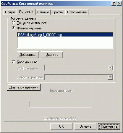 Для сужения интервала времени, который подвергается анализу, откроем Свойства любого из счетчиков и перейдем на закладку " Источник ". В нижней части панели подвинем границы анализируемого интервала и установим нужный нам " Диапазон просмотра " (рис. 16.27).