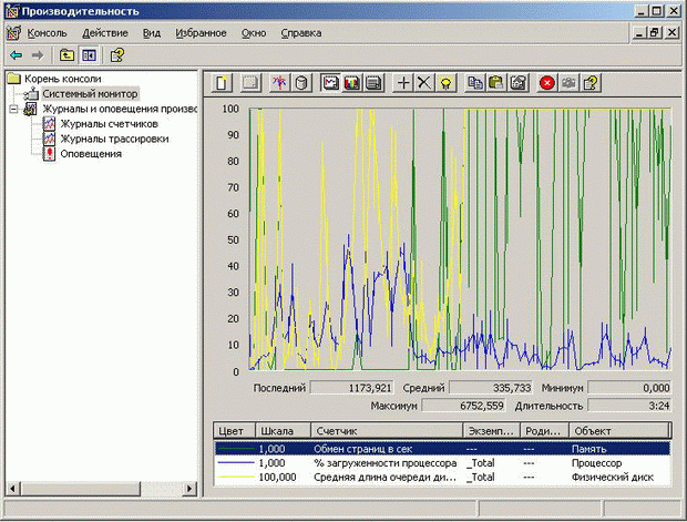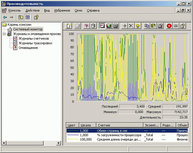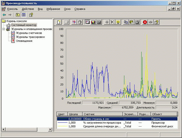Консоль " Производительность " (находящая в разделе " Администрирование " Главного меню системы Windows) позволяет более детально исследовать функционирование системы по сравнению с " Диспетчером задач ". И, кроме того, данная консоль позволяет накапливать статистику о работе системы в фоновом режиме, без непосредственного наблюдения администратором системы, а также собирать данные о производительности с нескольких компьютеров одновременно. Данная консоль содержит два раздела — " Системный монитор " и " Журналы и оповещения производительности ". " Системный монитор " предназначен для наблюдения за системой (или системами в режиме реального времени), " Журналы и оповещения производительности ". используются для накопления статистики в фоновом режиме и последующего изучения накопленных данных.