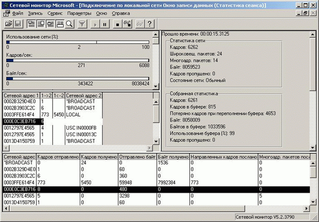 Левая верхняя панель показывает процент загруженности сетевого сегмента, скорость передачи кадров и скорость передачи байтов.