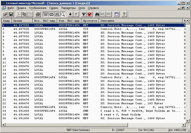 ). Первоначально при переходе в режим просмотра окно " Сетевого монитора " примет вид, изображенный на рис. 16.37 (в окне отображается полный список захваченных фреймов с краткой информацией о каждом из них):